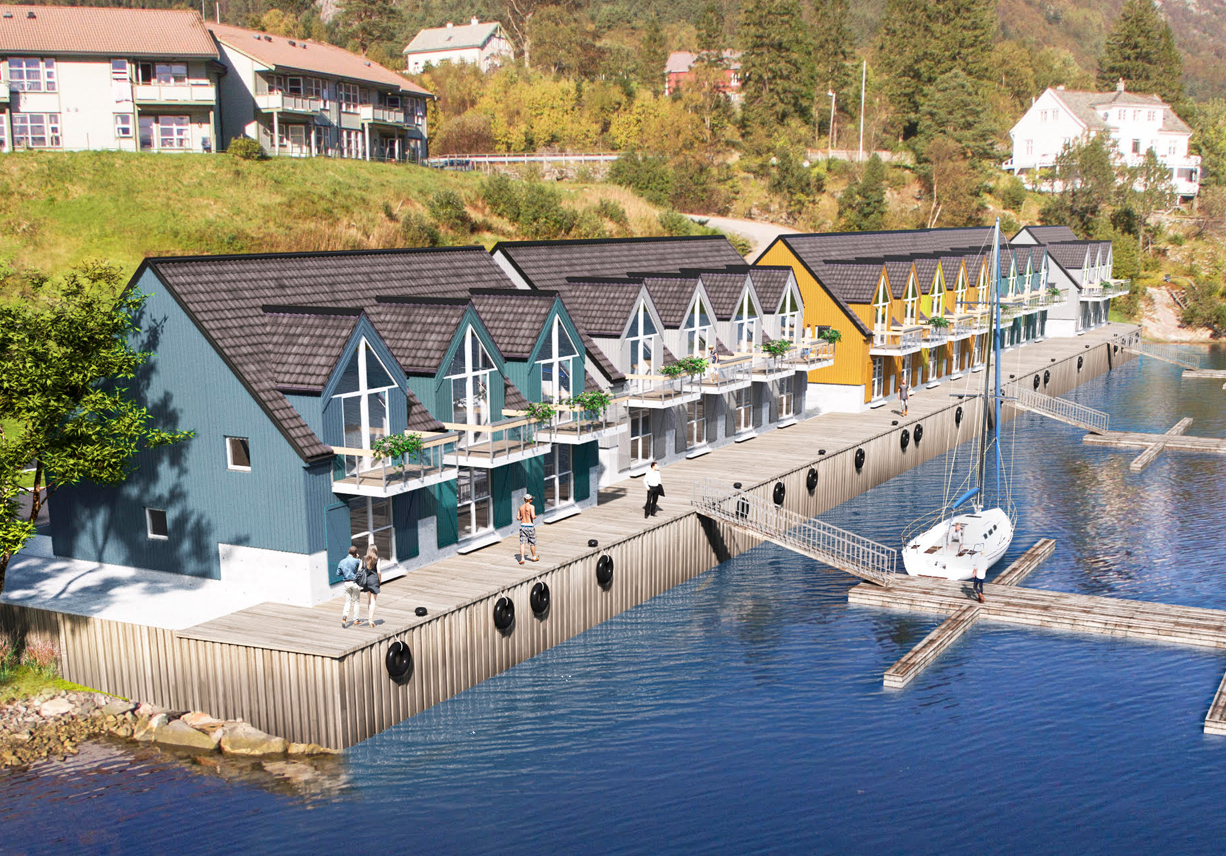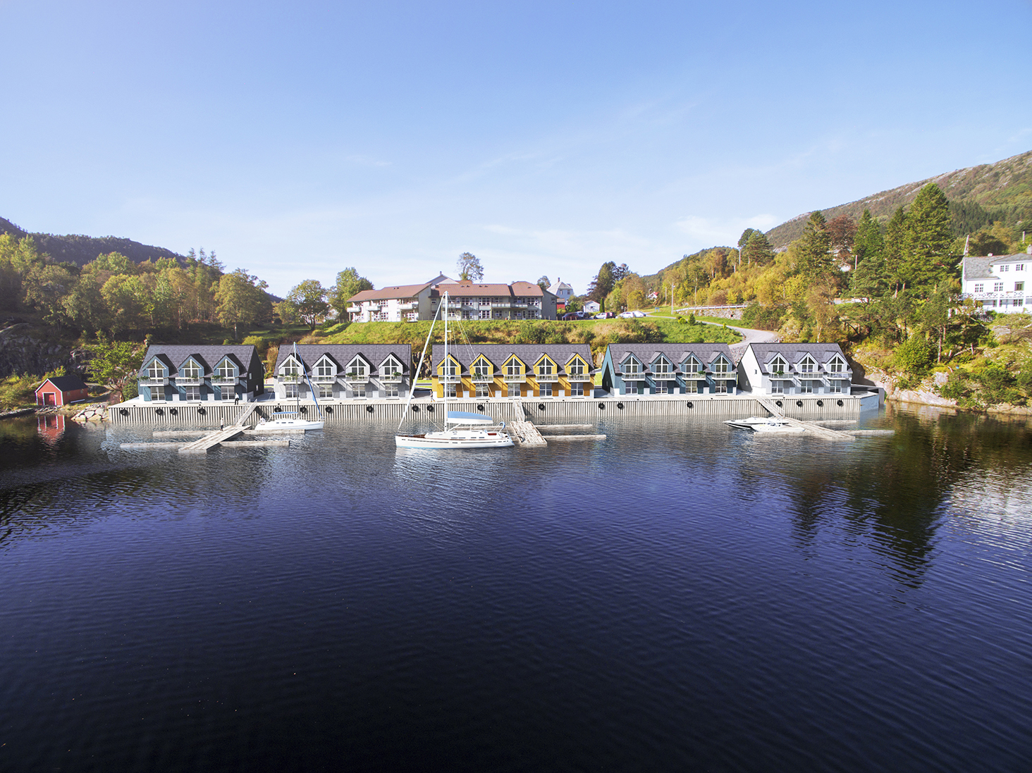Diskret for seg selv, men midt i bygda, og helt i sjøkanten, ligger de 19 arkitekttegnede rorbuene, designet i en stil som skal reflektere stedets kystkultur. Med store vinduer ut, og med en bred, flott brygge, kan du våkne til bølgeskvulp hver dag.